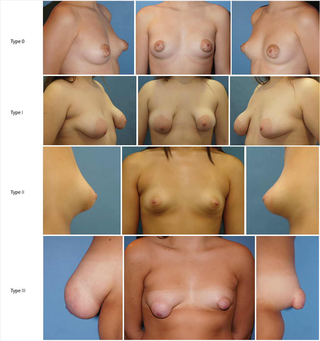 Type II: With normal or enlarged upper quadrants, lower inferior quadrants are deficient horizontally and vertically. As a result, the IMF is ascended and the areola points downward. Overall, the breast size is usually small and ptotic.