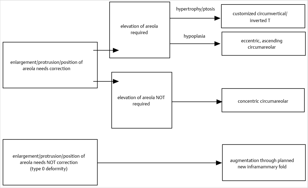 Depending on the specific findings, the incisional approach can be circumareolar, customized circumvertical/inverted T, or inframammary at the new fold. Decision-making as regards to incisions is shown in Fig. 37‑3.