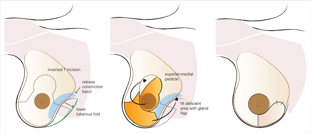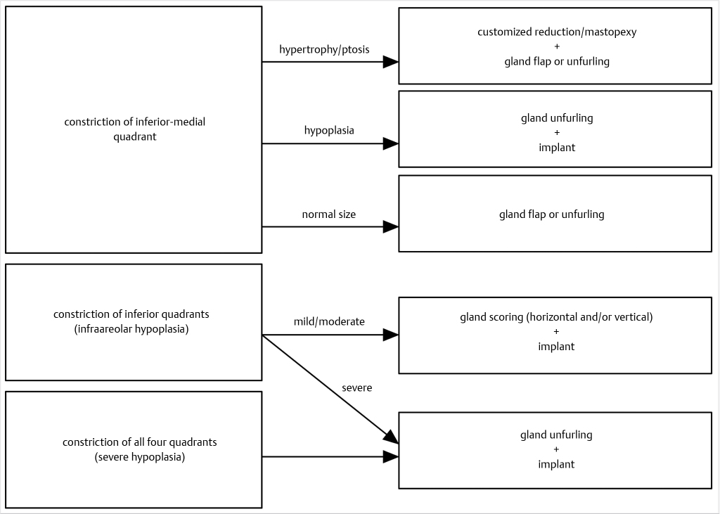 Gland redistribution is the single most important aspect of a successful treatment in severe cases because it is the improvement of the breast shape, and not size, that really defines a good result. Surgical objectives are three: (1) release of the fascial constriction band, (2) tissue redistribution from excessive to deficient areas, and (3) attain a harmonious, aesthetically pleasant relationship among the four breast quadrants. Different options are available in Fig. 37‑4: