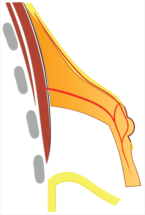 The vascular supply of the unfurled flap comes from the nipple-areola complex (NAC) vascular network (Fig. 37‑7). The NAC has a rich superficial (subcutaneous) and deep vascular supply (via transpectoral perforators) arising from the internal mammary artery, the highest (superior) thoracic artery, the anterior and posterior branches of the intercostal arteries, the thoracoacromial artery, the superficial thoracic artery, and the lateral thoracic artery. 25 , 26 Although no studies have been done regarding the vascular supply of the unfurled flap, clinical experience and basic knowledge on microvascular flap hemodynamics indicate that the vascularity of the flap is safe if properly executed: (1) the thickness at the flap base should not be less than 1 cm, (2) the retroglandular dissection should not go beyond the upper areolar margin to preserve any perforating vessels that might reach the NAC through the upper gland, and (3) the width-to-length ratio should be maintained within reasonable limits.