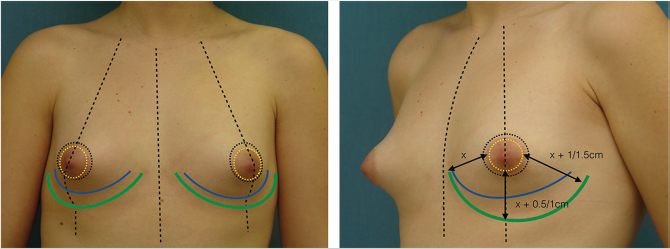 The patient is marked preoperatively in the upright position. A vertical line is first drawn at the body midline followed by a midaxial line on both breasts. The existing fold is marked on both breasts, with a special attention to the usual fold asymmetries (which should be corrected). The planned new fold is then marked as previously published by the authors, albeit more conservatively to minimize the risk of necrosis of the infra-areolar skin. 29 , 30 A doughnut-shaped circumareolar marking is done for a final 4-cm areolar diameter. Supra-areolar skin can be deepithelialized if an areolar lift is required. Skin de-epithelialization should always be cautious when augmentation is planned (Fig. 37‑8).