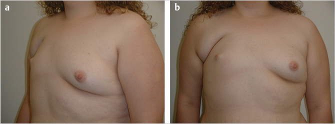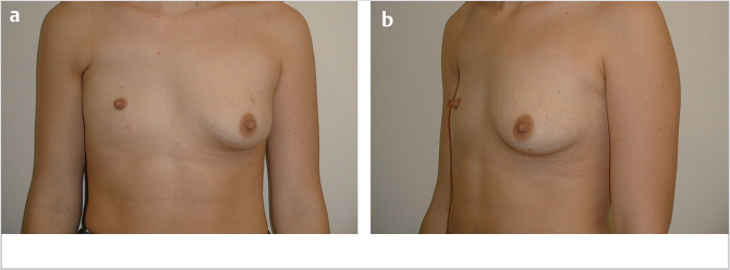 Fig. 38.2 (a,b) Young prepartum woman with right-side Poland syndrome. She has complete absence of the pectoralis major muscle and lack of breast development, as well as hypoplasia of the right nipple complex. Note the much more significant soft-tissue deficit of the chest wall, compared to the patient in Fig. 38‑1.