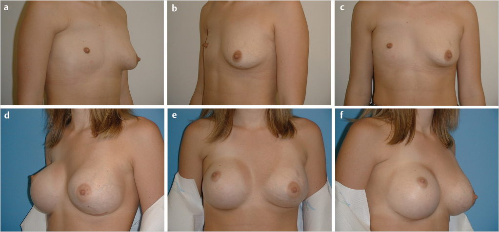 Fig. 38.4 (a-c) Prepartum patient from Fig. 38‑2 with three preoperative views. Reconstruction has been done with latissimus dorsi flap with sublatissimus expansion, followed by bilateral implant placement. (d-f) Despite overall good symmetry, the profound preoperative upper lateral soft-tissue depression persists.