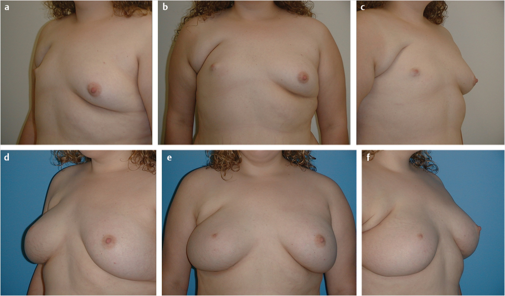 In cases of complete or near complete absence of breast development, or in cases of an ipsilateral large-sized breast, flap reconstruction may be necessary due to soft-tissue demands for symmetry. Latissimus dorsi muscle transfer is the option of choice in prepartum women (Fig. 38‑4), while abdominally based, pedicled or free, flaps are generally reserved for women following child bearing. Free tissue transfer using nonabdominal tissue, such as gluteal or transverse thigh flaps, would fully avoid alterations in abdominal anatomy and could be safely used in prepartum women.
