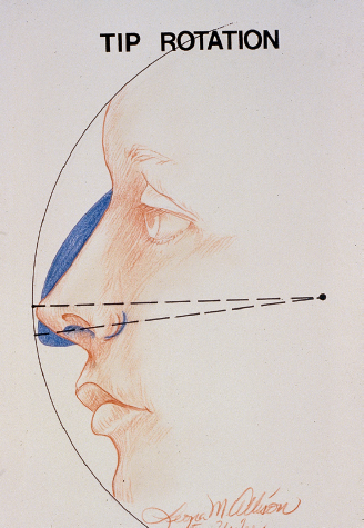The cephalic movement of the nasal tip along the same radial arc from the facial plane defines tip rotation ( Fig. 38.4 ). Rotation is accomplished through the interrelated steps in rhinoplasty involving lowering of the nasal dorsum, shortening of the caudal septum, plumping of an acute nasolabial angle, and resecting the cephalic portion of the lower lateral cartilage. A conservative cephalic resection of alar cartilage alone does little to effect tip rotation. Also, overzealous resection leads to postoperative sequelae of alar collapse and nasal bossae.