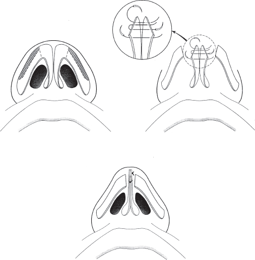 Sharp edges of cartilage are trimmed and the sutured crura are repositioned in the lobule. A final, high, securing suture closes the space between the caudal septum and membranous septum. No effort is made to suture medial crura directly to septum. The marginal incisions are closed and no attempt is made to suture the medial to the lateral crura ( Fig. 38.8 ).