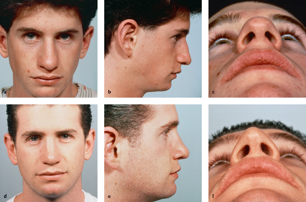 It is critical to preserve at least 8 to 10 mm of width of the lateral crura when trimming the cephalic border. It is worth reemphasizing that one should not borrow more than 2 or 3 mm from the lateral crus when dividing the dome vertically. Remembering these admonitions will help one to avoid the outcome of an unnatural tent pole appearance ( Fig. 38.7 ).
