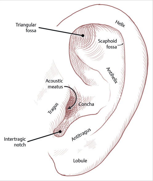 The ear is a composite of cartilage and skin with five key elements—concha, helix, antihelix, tragus, and lobule. Additional structures are antitragus, intertragic notch, and Darwin’s tubercle (Fig. 39.1).