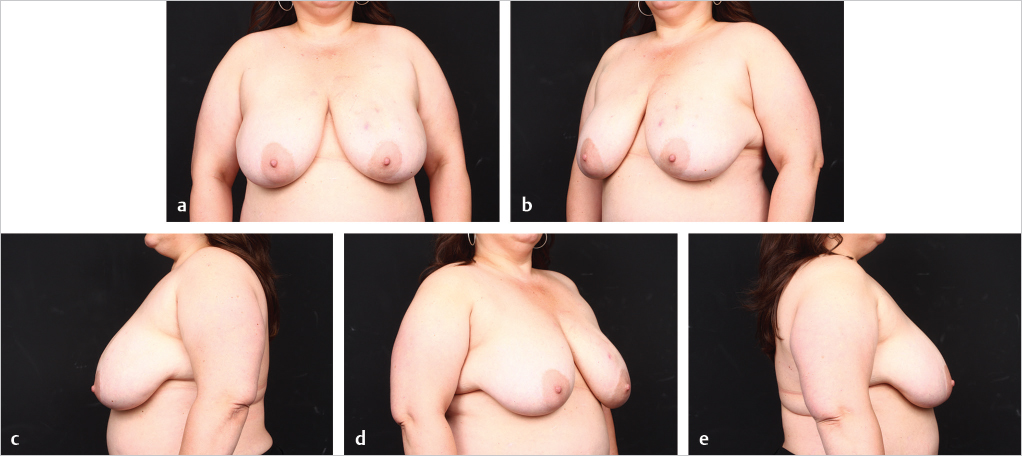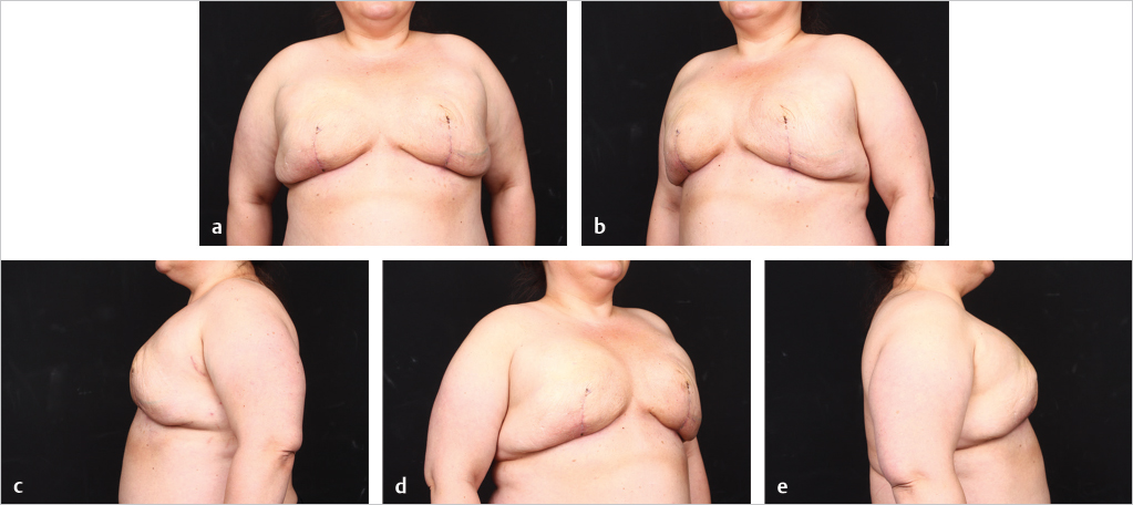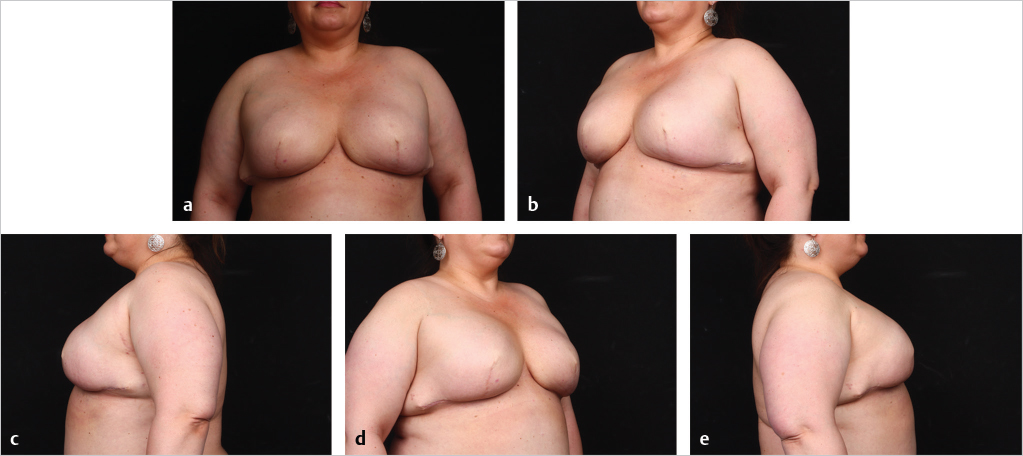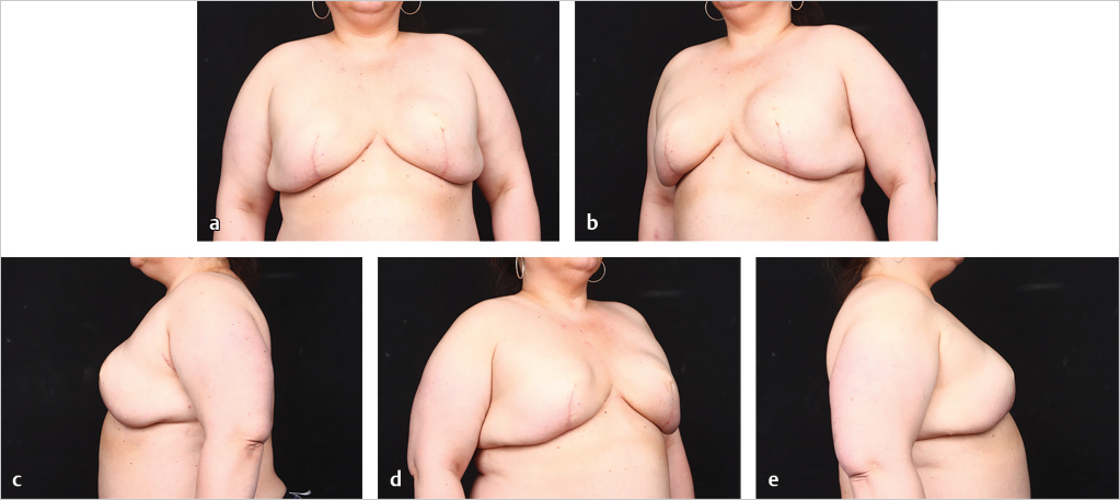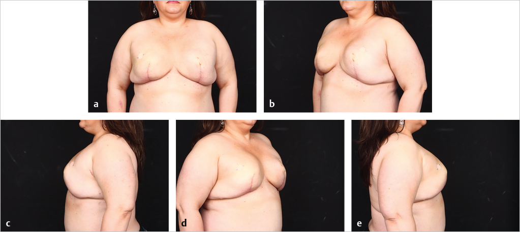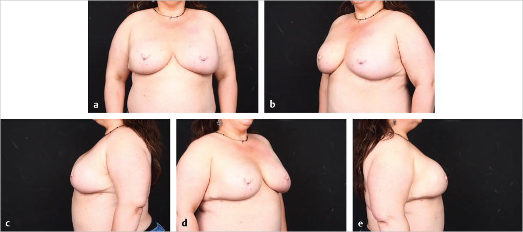 The author’s’ experience with prepectoral expander/implant reconstruction in obese patients involves 39 patients, including 18 with a BMI ≥ 35 kg/m2 and 12 with a BMI ≥ 40 kg/m2. A total of 73 breasts were reconstructed. Complications occurred in 12 breasts and included incisional dehiscence (4 breasts), skin necrosis (5 breasts), fat necrosis (2 breasts), seroma (2 breasts), infection (1 breast), and hematoma (1 breast). Three of the complications required return to the operating room for corrective surgery. There was one reconstructive failure with conversion to a latissimus flap. Aesthetic outcome was good to acceptable in all patients (▶Fig. 39.8, ▶Fig. 39.9, ▶Fig. 39.10, ▶Fig. 39.11, ▶Fig. 39.12, ▶Fig. 39.13, ▶Fig. 39.14). These results are comparable to, if not better than, those reported with subpectoral reconstruction in obese patients. Employing a similar technique of skin reduction mastectomy followed by prepectoral reconstruction using an acellular matrix in conjunction with a dermal flap, Caputo et al have also reported low complication rates in patients with large, ptotic breasts.