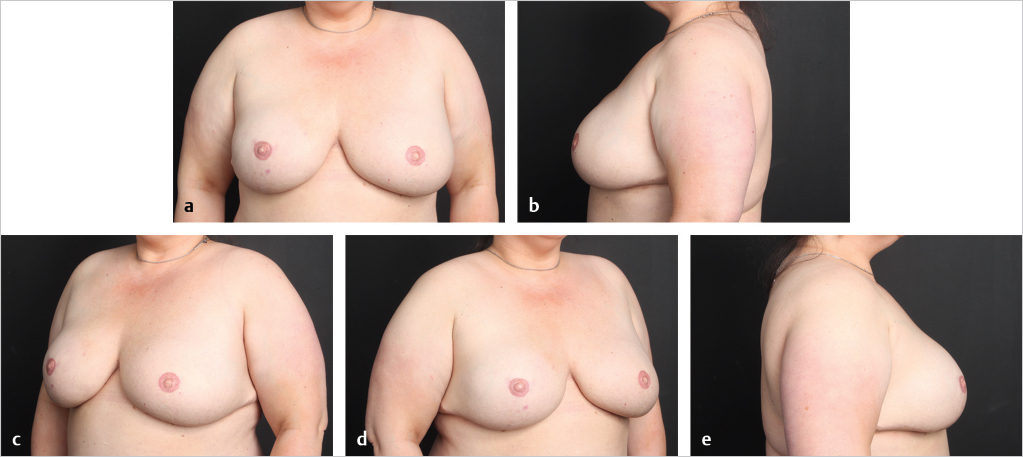Fig. 39.2 (a–e) Twenty-one days postoperative following bilateral skin-reducing mastectomy with prepectoral immediate recon with 133-mv 400-cc expanders and acellular dermal matrix (AlloDerm).