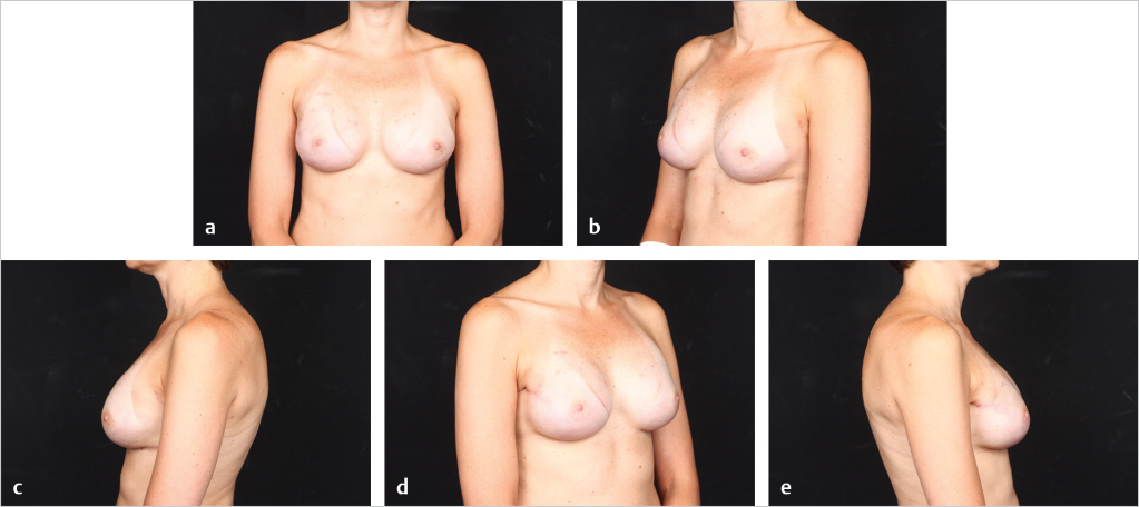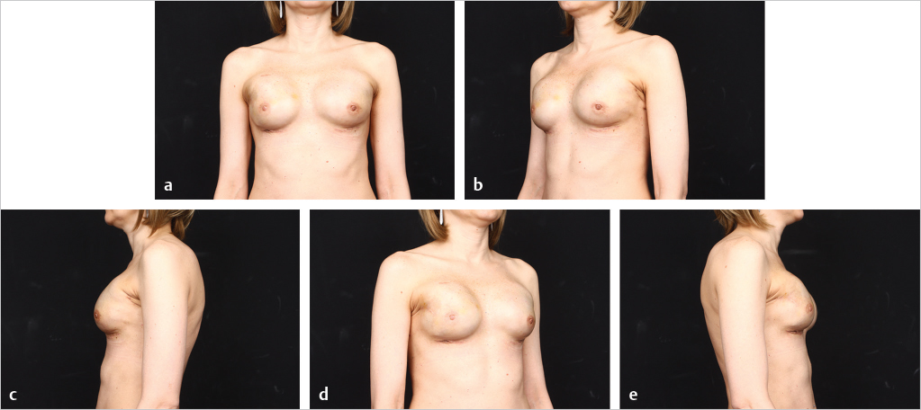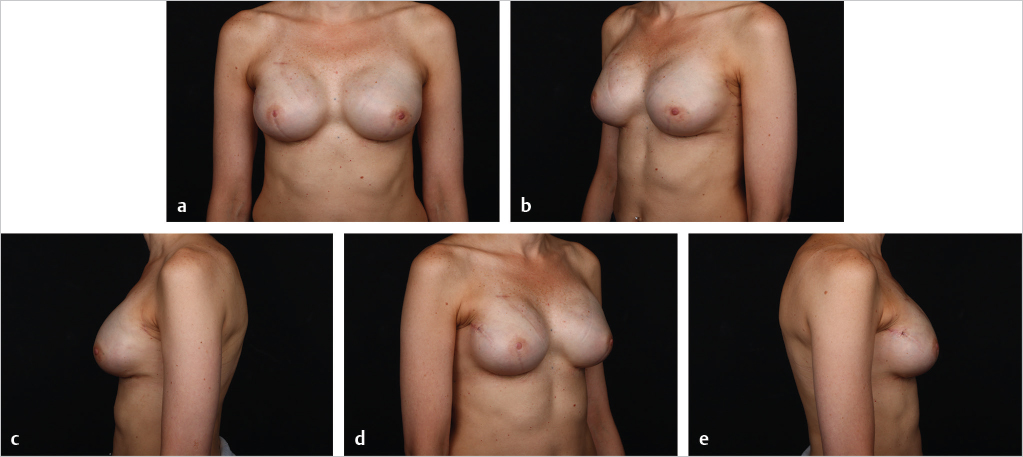 Fig. 39.6 (a–e) Five months post second stage and 30 days post bilateral nipple reconstruction and fat grafting.