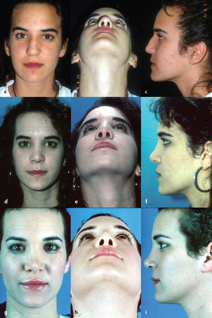 Fig. 39.1 Rhinoplasty patient shown (a–c) preoperative, (d–f) 1 year, and (g–i) 10 years postoperative.