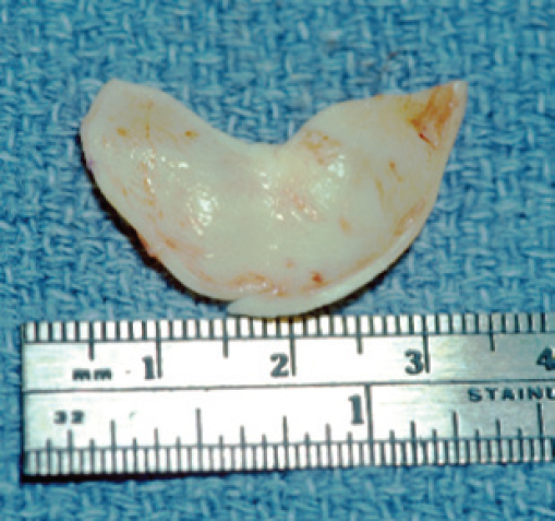 In some patients, irradiated homologous costal cartilage may be an alternative to autologous cartilage. In the specific patient with multiple comorbidities, weak auricular cartilage, or ossified costal cartilage, irradiated homologous costal cartilage may be the best choice. Additionally, in someone who is in need of significant dorsal augmentation this can mitigate the need for harvesting a large piece of rib. Proponents of irradiated homologous costal cartilage emphasize the large quantity of grafting material available and the lack of donor site morbidity as reasons for its use. 7 In addition to dorsal onlay, it can be used for a wide variety of grafts including tip grafts, columellar strut, or alar batten grafts. However, unpredictable resorption and warping of the graft have been noted in longterm followup studies. 8 Donor site morbidity, risk of reabsorption, infection, and warping are all factors that must be weighed and considered with the patient.