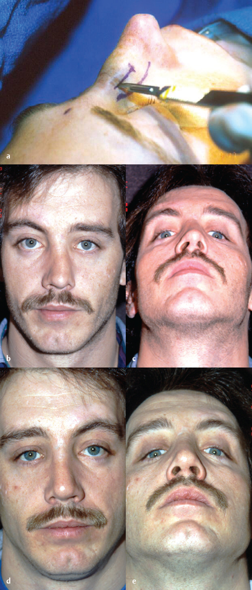 Fig. 39.6 (a) Intermediate osteotomy. (b, c) Patient with bony deformities after primary rhinoplasty. (d, e) Patient after intermediate and lateral osteotomies.