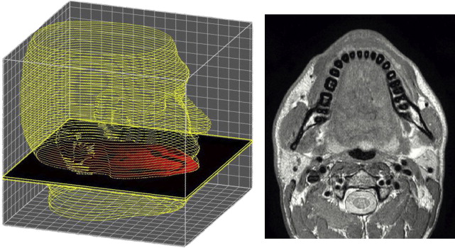 High-resolution magnetic resonance imaging (MRI) data were acquired for determination of the shape of bones, soft layers, and muscles. This procedure is commonly used to generate 3D anatomic models. Using a Philips Achieva 1.5T scanner, 150 slices at a distance of 2 mm with an in-plane resolution of 0.5 mm were obtained for the head and neck of a 27-year old man lying in the supine position. The high quality of images obtained resulted from an iterative optimization considering acquisition time and ability of the tested person to maintain a relaxed position, without muscular contractions. Fig. 1 shows an example of a transverse MRI image.