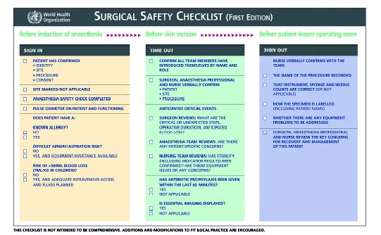 Like the WHO Surgical Safety Checklist, the JCAHO NPSG program has a three-phase approach to improving perioperative safety: a preprocedure verification process, marking the surgical site, and performance of a time-out.31 The pre-performance verification process includes identifying the correct person, surgical site, and procedure at each of the following times: