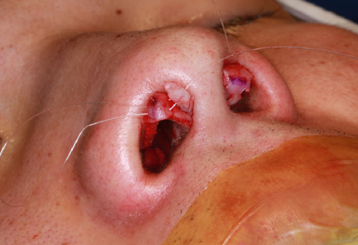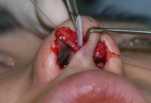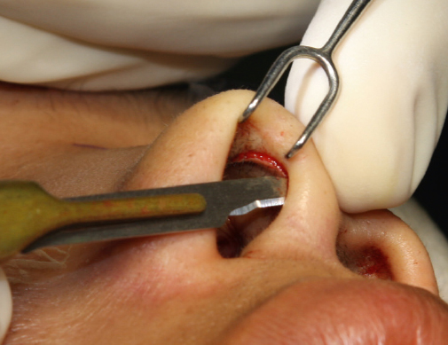 Cartilage harvested from the nasal septum or the ear is designed according to the planned procedure (e.g., cap graft, shield graft, or columellar strut). The incision can be modified based on the size and the nature of the intended graft, but bilateral infradomal marginal incisions extending to the lateral columella are usually employed to expose and dissect both lower lateral cartilage domes and the medial crura. An intradomal suture is done at the lower lateral cartilage to produce a slight increase in projection. This suture begins from the upper part of the medial crus medially, passing through the intermediate crus to exit at the lateral crus.