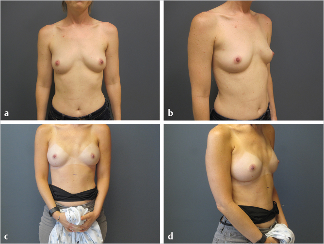 Fig. 4.2 Nipple-sparing mastectomies and immediate implant reconstruction via inframammary fold incisions. (a,b) Preoperative appearance. (c,d) Postoperative appearance.