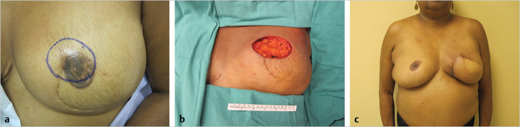 NSM is growing in popularity because of its perceived aesthetic benefits (▶Fig. 4.2). Patient satisfaction with nipple–areolar reconstruction following SSM can be disappointing. Data regarding the oncological safety of NSM are hampered by small sample size, varying indications and surgical techniques, and short follow-up (▶Table 4.2). There are limited oncological and reconstructive indications to perform NSM. Large tumors and those located in the central breast have an increased incidence of nipple involvement. Larger, more ptotic breasts are not good candidates for the procedure. Nipple elevation cannot be achieved without preservation of a dermoglandular pedicle, which impacts the completeness of mastectomy. The ideal candidate for a NSM has small-to-moderate–sized breasts with minimal ptosis.