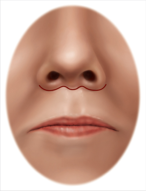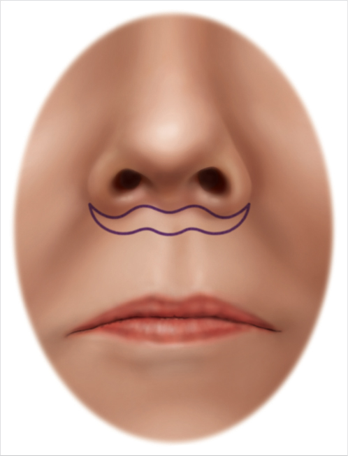 Fig. 40.1 Markings are designed in a bull’s horn pattern with the superior border drawn just inferior to the columellar base and nostril sill and extending along the alae to the alae-facial grove, allowing a for more lift laterally.