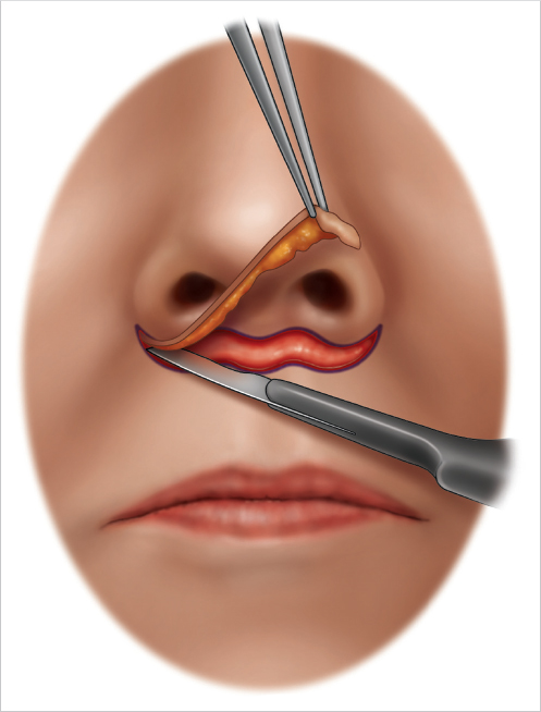 Markings are designed in a bull’s horn pattern with the superior border drawn just inferior to the columellar base and nostril sill and extending along the alae to the alar-facial grove, allowing for more lift laterally (Fig. 40.1). The inferior border is marked based on the amount of desired tissue excision, keeping in mind the aforementioned aesthetic ideals (lip length, incisal show, etc.) and noting any asymmetries.