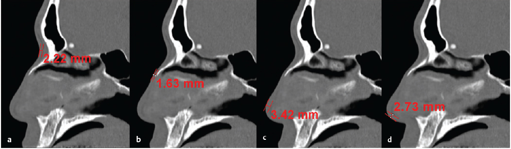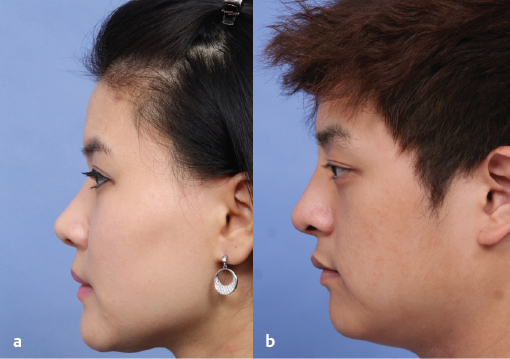 East Asia encompasses China, Korea, Taiwan, and Japan. Also, there are many Chinese descendants in Southeast Asian countries including the Philippines, Thailand, Malaysia, and Vietnam. The typical East Asian nose tends to have thicker nasal skin than Caucasian noses, with abundant subcutaneous soft tissue. In author’s research using computed tomography (CT) scans on the thickness of the nose in Koreans, the mean nasal skin thickness was 3.3 mm for nasion, 2.4 mm for rhinion, 2.9 mm for nasal tip, and 2.3 mm for columella ( Fig. 41.1 ). In the author’s study, thick skin at the nasal tip and columella was associated with poor surgical outcomes, suggesting that regional skin thickness is an important prognostic factor for tip surgery success. 1 The tip of the East Asian nose is usually low and the lower lateral cartilages are small and weak. The nasal bones are poorly developed and thick, thus manifesting low radix. The average nasal length to nasal tip projection to dorsal height to radix height ratio of the Caucasian nose has been shown to be 2:1:1:0.75. 2 However, in the author’s study, young Koreans had a nasal length to nasal tip projection to dorsal height to radix height ratio of 2:0.97:0.61:0.28. 2 These data indicate that East Asians had lower dorsal and radix heights. It was also found that East Asians have a more acute nasolabial angle than Caucasians, but a similar nasofrontal angle. The septal cartilage is thin and small. Therefore, the size and the quantity of harvestable septal cartilage may be inadequate for complete rhinoplasty procedures, indicating the higher possibility of harvesting grafts from other sites. 3