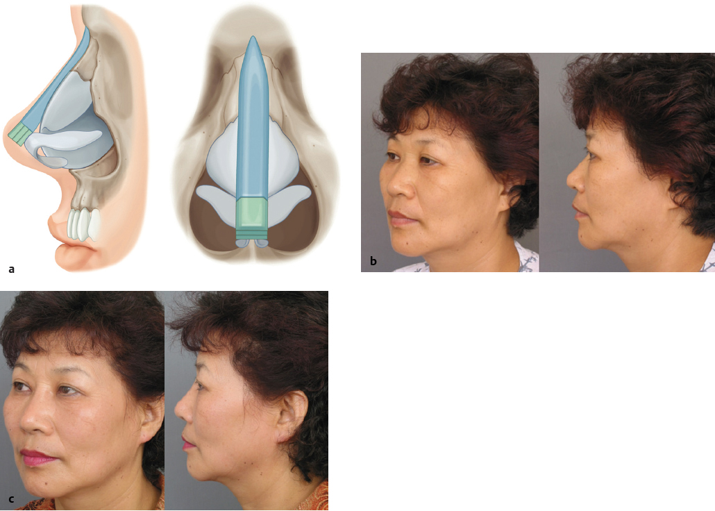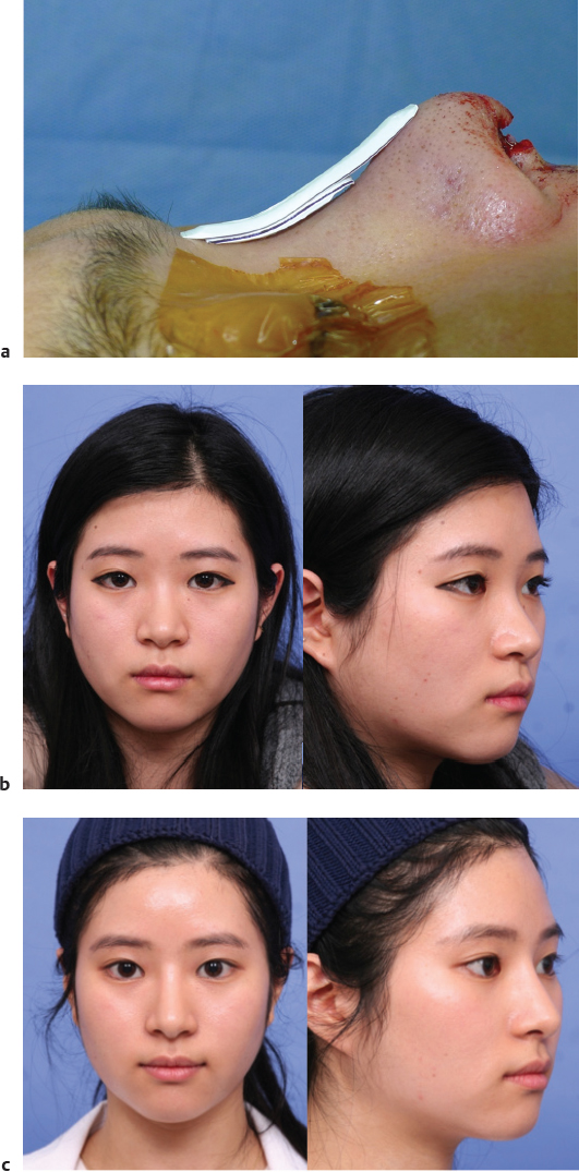 Alloplastic implants generally need to be biocompatible, nontoxic, chemically safe, and nonimmunogenic. In addition, they must not induce infection, cancer, or produce toxic substances within the body. Additionally, during recovery, these implants should maintain their original size, shape, and hardness. At present, the most commonly used alloplastic implants that meet these conditions are silicone, Gore-Tex, and Medpor (Stryker). There is no single ideal implant or graft for dorsal augmentation. Each and every material has its own merits and drawbacks. 4 Thus, when surgeons choose a dorsal implant material, they should consider the material characteristics and anatomical characteristics of the patient, and their own level of expertise in using each material. Based on my own experience, delayed inflammations and infections that are exhibited a long time after surgery are more common in alloplastic implants, and if not treated adequately, can cause serious deformations. Longterm followup of rhinoplasty patients demonstrates that aesthetic complications are much more frequent in biologic implants. The reasons are visibility of the dorsal cartilage implant, absorption or deformation, and absorption occurring in cases using fascia or dermofat.