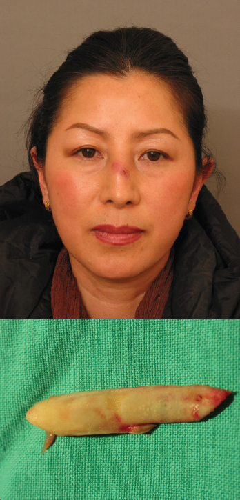 The advantage of autologous material for the dorsal augmentation of the nose cannot be questioned as these implants are well tolerated and carry the least risk of infection. However, if any autologous tissue other than septal cartilage is selected, the additional operative time required to harvest the graft and donor site morbidity become limiting factors. Common autologous tissues used for dorsal augmentation include septal cartilage, conchal cartilage, costal cartilage, fascia, and dermofat. As it is easy to harvest and shape the septal cartilage, it can be used to moderately elevate the nasal dorsum, to camouflage a partial concavity on the dorsum, and for nasal tip surgery. Since Asian patients have relatively small noses, a major limitation in the use of septal cartilage for dorsal augmentation is its limited availability; the amount of harvested septal cartilage is not always enough for simultaneous use in multiple grafting procedures. 3 Furthermore, it is often difficult to carve the cartilage to fit nicely onto the dorsum without irregularity.