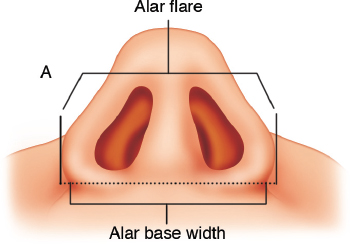 Analysis of the basal view gives vital information about the alar lobule, degree of alar flare, alar–facial transition, nostril shape, size and symmetry, upper lip length, and transition at the nasolabial point. Most patients of African descent have some degree of alar flare, which should be preserved even after nostril reduction. Using cotton-tipped applicators gently placed in the nostrils, the nasal tip can be projected to gain a sense of the secondary changes in alar flare that can occur after surgical manipulation.