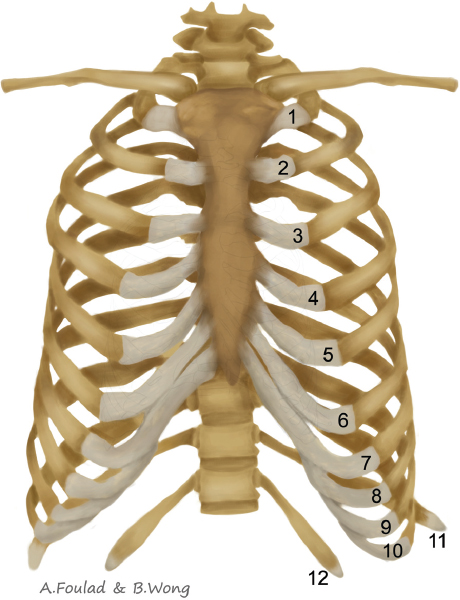 The costal cartilages are extensions of hyaline cartilage from the anterior ends of the ribs and contribute to the elasticity of the thoracic wall ( Fig. 43.1 ). Each of the 12 paired ribs articulate posteriorly with the respective thoracic vertebrae. Anteriorly, the first seven pairs of ribs, also known as true ribs, attach directly to the sternum through their respective costal cartilages. Typically the costal cartilages of ribs six and seven have an intercostal attachment. The remaining five pairs of ribs (8 through 12) either have an indirect attachment or no attachment to the sternum, and are known as the false ribs. 8 , 9 , 10