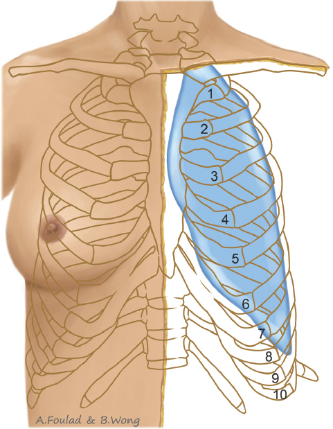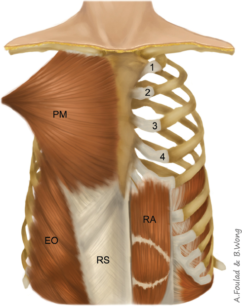 Deep to the skin and subcutaneous layers, the costal cartilages are covered by muscle ( Fig. 43.2 ). The upper costal cartilages are largely covered by the pectoralis major muscle which originates from the clavicle, sternum, superior seven costal cartilages (often does not include the first and seventh ribs), and external oblique aponeurosis. As the fibers of the pectoralis major muscle converge, a fanlike structure is formed that inserts onto the humerus. The rectus abdominis muscle is a more slender straplike muscle that extends over the lower costal cartilages as it originates from the pubic bone and inserts onto the costal cartilages of ribs 5, 6, and 7. Notably, a dissection of Asian cadavers revealed a main insertion onto the sixth rib, with no distinct fibers extending to the fifth rib. 13 Three layers of muscles are located lateral to the rectus abdominis muscle, which include, from superficial to deep, the external oblique muscle, internal oblique muscle, and transverse abdominis muscle. These muscles extend medially to form the rectus sheath that envelopes the rectus abdominis muscle.