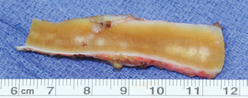 Radiologic imaging for assessing the costal cartilages may be helpful when there is concern for mineralization or abnormality. The presence of calcification causes cartilage to become more stiff and brittle, which can increase carving difficulty and potentially result in an unsuitable graft ( Fig. 43.3 ). Several studies have evaluated the degree of costal cartilage calcification as related to age and gender. 14 , 15 , 16 While the current literature does not enable precise guidance with respect to the degree of calcification as a discrete function of age, there is a general trend of increased calcification with age. Calcifications within the first couple decades of life are typically insignificant, while severe calcifications are more common during later years of life. Some surgeons consider obtaining computed tomography imaging of the chest in patients older than approximately 50 years of age. A more recent study, performed on an Asian population, revealed that female gender is associated with a greater calcification at a younger age. 17 Imaging may also be helpful for patients subjected to chest trauma, such as in boxers and professional football players. As an alternative to reduce cost and eliminate radiation, ultrasound may have a role in evaluating the costal cartilages. 18 Regardless of modality, the goal of imaging is to determine whether suitable cartilage for grafts exists and to aid in selecting the most appropriate costal cartilage to harvest.