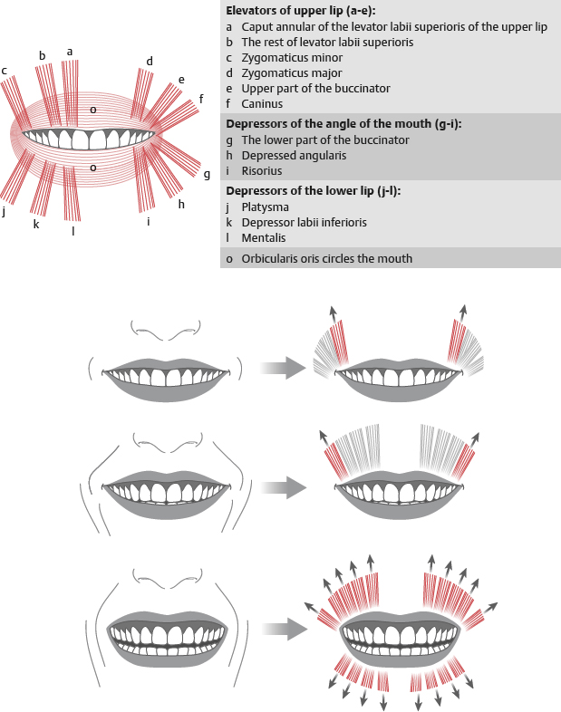 The lip elevator muscles and the “fold muscles” course down the lip to traverse the orbicularis oris and insert into the dermis of the (1) upper lip, (2) the cutaneous vermilion junction, and (3) the vermilion.