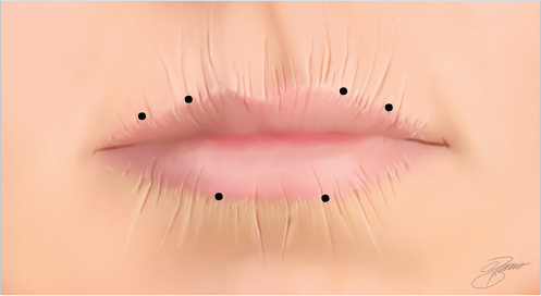 Injections should be just above the vermilion border, and no higher than 5 mm above the border to avoid inversion, eversion, or lip ptosis.