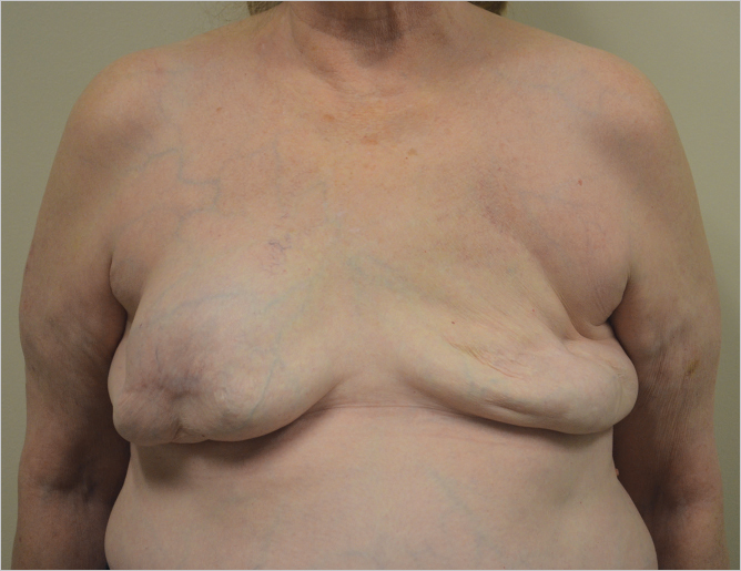 Fig. 43.1 Preoperative view of a 60-year-old woman with poor results from a subpectoral two-stage expander reconstruction using saline implants. The left implant had deflated and she was referred for conversion.