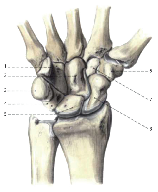 The wrist is a complex joint that consists of two long bones and eight carpal bones. There are three main articulations (► Fig. 45.1):