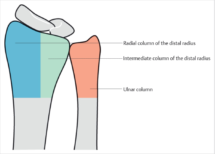 The column concept proposes a theory in which load is transmitted throughout the wrist (► Fig. 45.2). Under normal physiologic conditions, the majority of load is transmitted across the intermediate column and a minor amount along the radial column. The ulnar column also withstands a significant load as it serves as the stabilizer of wrist pronation/supination, flexion/extension, and radial/ulnar deviation. 2
