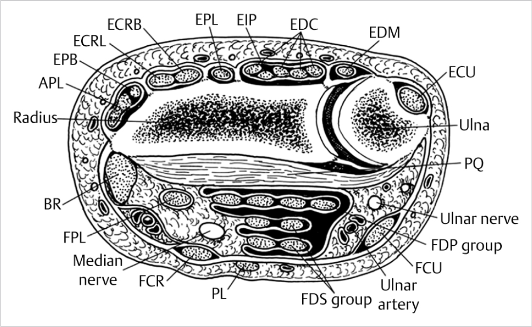 With bridge plating, an apparatus intimately involving the extensor compartments is utilized (► Fig. 45.4). These compartments are as follows: