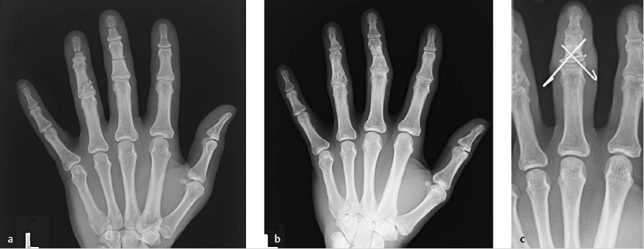 Malunion management is variable and is up to individual surgeon and patient preference, as patients will have different functional requirements and personal desires. 1 While most malunions involve a combination of deformities, usually there is one major component causing functional change and causing surgical consideration. 3 Phalangeal malunions greater than 15 degrees in the sagittal plane or 10 degrees of malrotation that are symptomatic or functionally obstructive may benefit from osteotomy. 1 , 3 Other indications include pain or decreased grip strength. 4