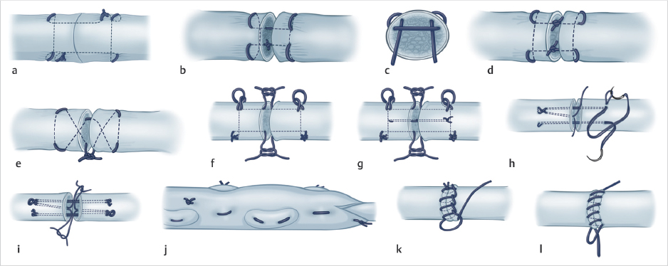 Fig. 5.1 (a) Original Kirchmayer/Kessler: Two sutures (two-strand) with knots buried in the tendon outside the suture line. A two-strand core suture with knots. In the suture line or burled in the tendon outside the suture line. lntratendinous knots may have better gliding properties, but have more suture material in the tendon gap. Theoretically, sutures should be placed insofar as possible at the volar aspect of the tendon to avoid disturbance of the dorsally situated vessels. Too much compression at the suture line should be avoided to prevent bulging of the tendon repair with subsequent impairment of gliding. (b–e) Modified Kessler: One or two sutures (two-strand) with intratendinous knots. Cross section demonstrates optimal position of core sutures (continued). (f) Strickland’s “double grasp” modification of the Kirchmayer-Kessler technique (two-strand). (g) “Double grasp” technique with an additional rectangular mattress suture (four-strand). (h,i) Tsuge’s loop technique: Double loop (six-strand). (j) Pulvertaft technique: The tendon stumps are connected in a braided pattern–excellent tensile strength, allows early active mobilization. (k,l) Epitenon sutures: Epitenon sutures add considerable tensile strength to the tendon repair. They also smooth the contour of the tendon repair, thereby improving gliding properties. The two most commonly used patterns are running stitches (5–0) or interlocking sutures (5–0). A modification is a crisscross pattern that may increase tensile strength. (Modified with permission from Günter Germann, L. Scott Levin, Randolph Sherman. Reconstructive Surgery of the Hand and Upper Extremity, 1st edition. © 2018 Thieme.)