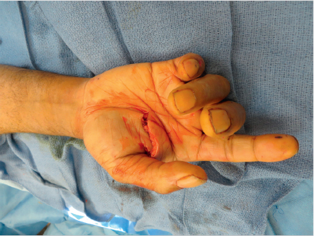 Fig. 5.2 Intra-op photo of a zone 3 laceration of both flexor digitorum superficialis (FDS) and flexor digitorum profundus (FDP) tendons to the index finger with resultant loss of resting cascade of the finger. Note the extended posture in comparison to the other un-injured digits.