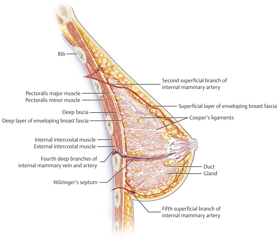 The vascularity of the breast is another important concern in considering the planes of dissection. The primary blood supply to the breast is derived from the perforating branches of the internal mammary artery (IMA). Van Deventer has demonstrated that of the six perforators emanating from the medial costal interspaces and arising from the IMA, the third perforator was most commonly seen, followed by the second, the first, and the fourth. 2 Many of these perforators form an anastomotic cluster around the periareolar region and enhance the vascularity to the NAC. These anastomoses are primarily formed from the lateral thoracic and internal mammary perforators. Le Roux demonstrated that the IMA perforators traverse superficially 1 cm under the skin surface. 3 A dominant vessel originates from either the third or the fourth intercostal space with a depth of 10.3 mm at the NAC boundary and 14.2 mm at 3 cm medially. Würinger demonstrated that the second, third, and fourth perforating branches of the IMA coursed within the medial vertical ligament of the breast toward the nipple. 4 The remainder of the vascular supply to the breast is derived from the lateral thoracic, anterior intercostal, thoracoacromial, posterior intercostal, and superficial thoracic arteries. It should be noted that although the vascularity of the breast is generally predictable, embryologic variation could result in vascular unpredictability of the NAC.