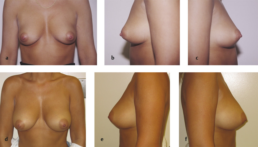 The salient details of the subglandular augmentation technique will be described. With the patient standing, the relevant breast landmarks are delineated and include the breast footprint and the proposed incisions. The incisional approach can be through the periareolar, inframammary, or transaxillary regions. The incision length varies from 3 to 5 cm, depending upon the size of the implant. The inframammary approach is the most common and will be profiled. A scalpel is used to create the incision through the dermis to the subcutaneous fat. Double-pronged skin hooks are used to separate the dermal edges, and electrocautery is used to dissect to the level of the fascia. At the level of the fold, the fascia may be that of the rectus abdominis or the pectoralis major. A narrow 90° retractor is used to elevate the upper soft tissue, and the dissection is continued in a cephalad direction. The inferior edge of the pectoralis major is identified. The dissection continues medially, superiorly, and laterally above the pectoralis major muscle and the pectoralis fascia. The borders of the dissection plane include the medial border of the pectoralis, the upper footprint of the breast parenchyma, and the lateral border of the pectoralis major. All perforating branches within the plane of dissection are identified and cauterized before bleeding occurs. It is important not to expand the pocket excessively but rather to create a space that will result in a hand-in-glove fit with the implant itself. Hemostasis is achieved, and the subglandular space is irrigated with an appropriate solution. Fig. 5‑3 illustrates a patient before and after subglandular augmentation.