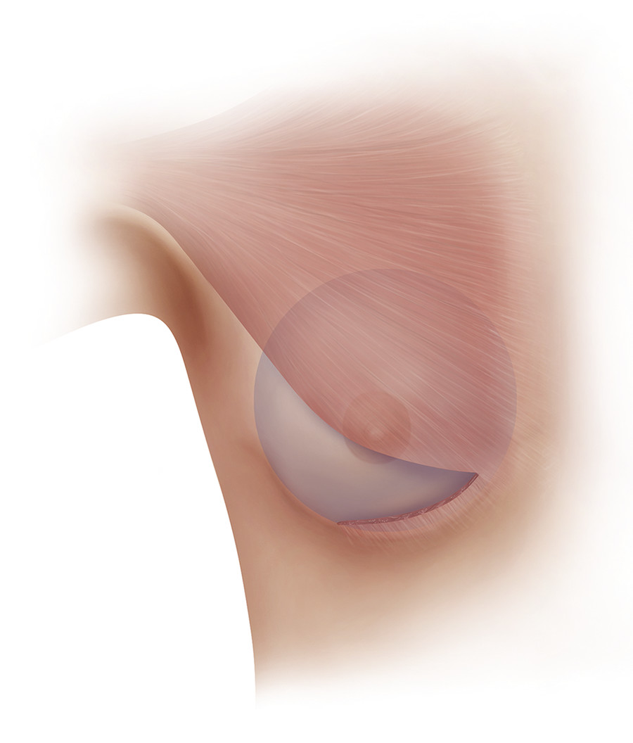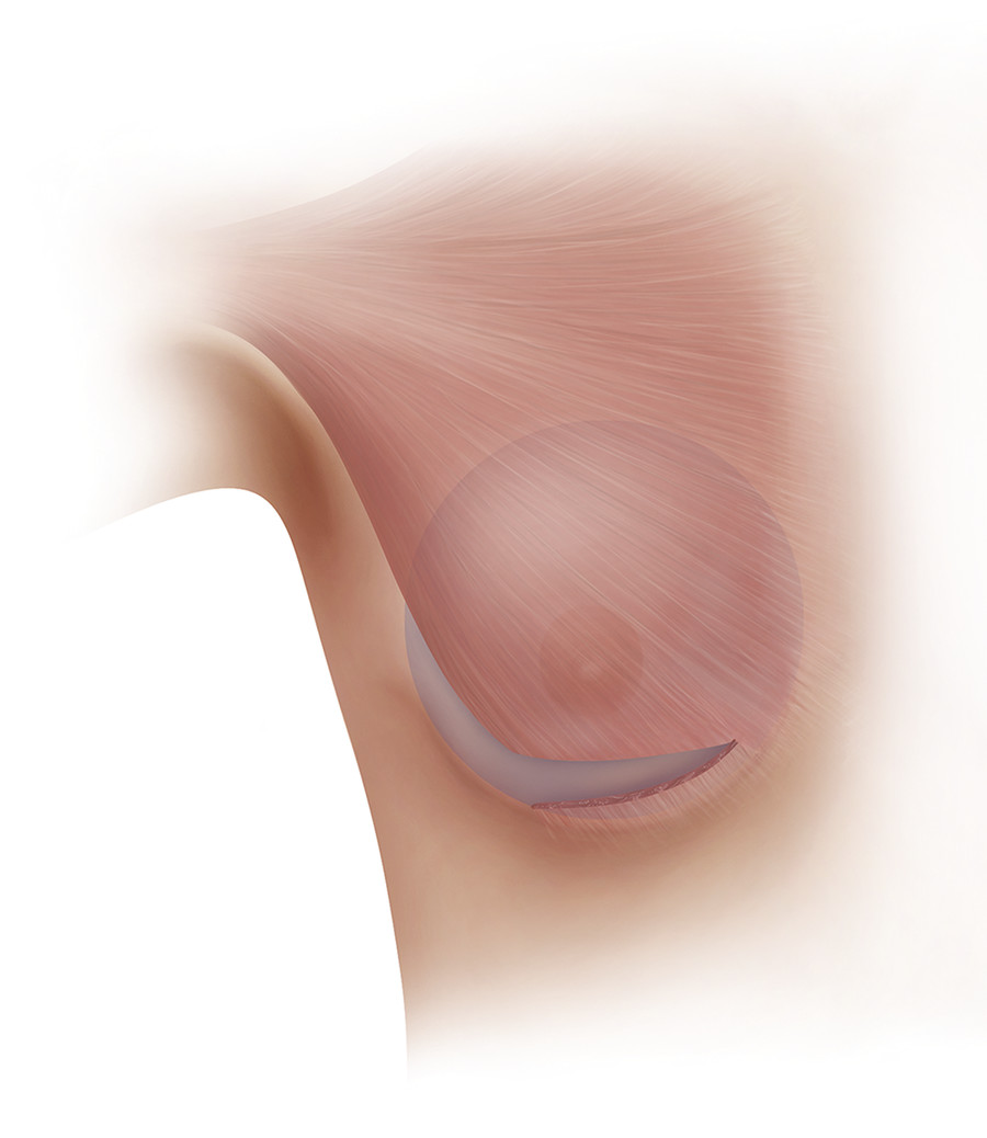When the inframammary approach is selected, a 3- to 5-cm incision is created along the crease. 24 In cases where the level of the IMF needs adjustment, the location of the incision is modified accordingly such that the final incision lies within the crease. The dissection progresses toward the inferior edge of the pectoralis major muscle. Once the pectoralis fascia is identified, it is incised and the subfascial plane is dissected.