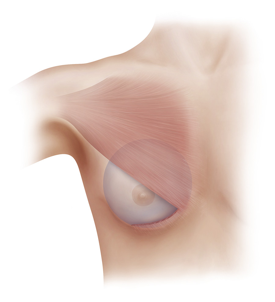 Dempsey and Latham were the first to consider the subpectoral position and performed the first subpectoral breast augmentation in 1968. 23 The advantages included less visibility, decreased ptosis, reduced capsular contracture, and increased longevity compared to subglandular placement. Like the subglandular and subfascial techniques, the technique of subpectoral augmentation can also be performed through a variety of access incisions that include the periareolar, transaxillary, and inframammary. Subpectoral augmentation can be performed using a total muscle coverage approach as well as partial muscle coverage. The total submuscular plane has been performed less frequently, primarily because the natural contour of the breast may be compromised and because it sometimes involves elevation of the serratus anterior muscle as well for lateral coverage. Indications for total muscle coverage are few. Partial subpectoral coverage has become far more common. The release of the inferior origin of the pectoralis major muscle allows improved lower pole projection and contour. Another benefit of the subpectoral positioning is that capsular contracture rates are generally lower compared to subglandular placement; however, this will also be dependent upon the surface texturing of the implant. 14