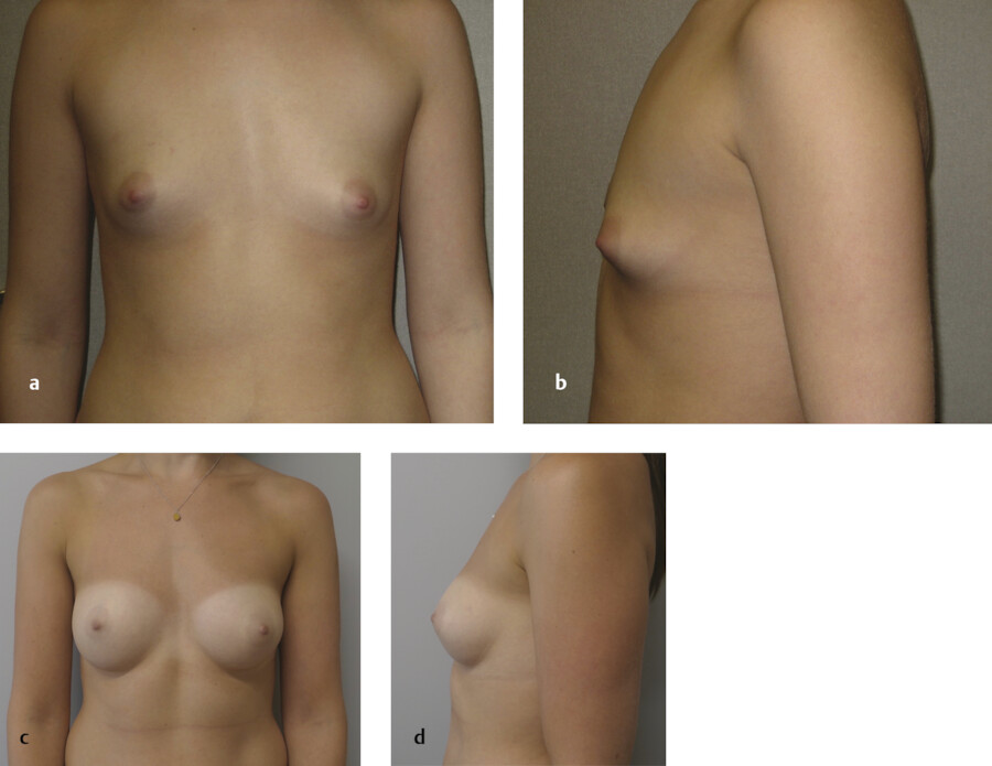 The actual creation of the subfascial pocket requires attention to several salient points. 24 During the undermining process, care should be exercised to avoid fascial injury such as thermal injury and perforation. In cases where it is very thin, inclusion of thin slips of pectoral muscle fibers may be elevated with the fascia. The dissection is performed using a low-set electrocautery device in coagulation mode to minimize any potential bleeding. Finger dissection can also be used to develop the subfascial plane and eventually to allow the insertion of an endoscope to facilitate the dissection. 21 Stoff-Khalili advocates for the dissection of breast tissue to begin at the lateral border of the pectoralis muscle and continue to the level of the pectoral fascia. 18 Once the fascia is identified, it is separated from the muscle using cauterizing scissors. It was noted that the thickness of the fascia increased from approximately 0.1 mm inferiorly to approximately 0.5 mm in the upper third of the pectoralis major muscle. According to Stoff-Khalili, this increase in thickness is sufficient to minimize implant rippling. Other maneuvers to facilitate the dissection include upward traction of the breast. The typical boundaries for the dissection include the second intercostal space superiorly, 1–2 cm from the midsternum medially, 5–8 cm below the NAC, and the anterior axillary line laterally. It is important to avoid dissection beyond the lateral border of the pectoralis major muscle to prevent lateral displacement of the implant. 21 It is also important to ensure hemostasis and to irrigate the pocket prior to implant insertion. Fig. 5‑4 illustrates a patient before and after subfascial augmentation.