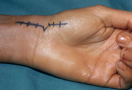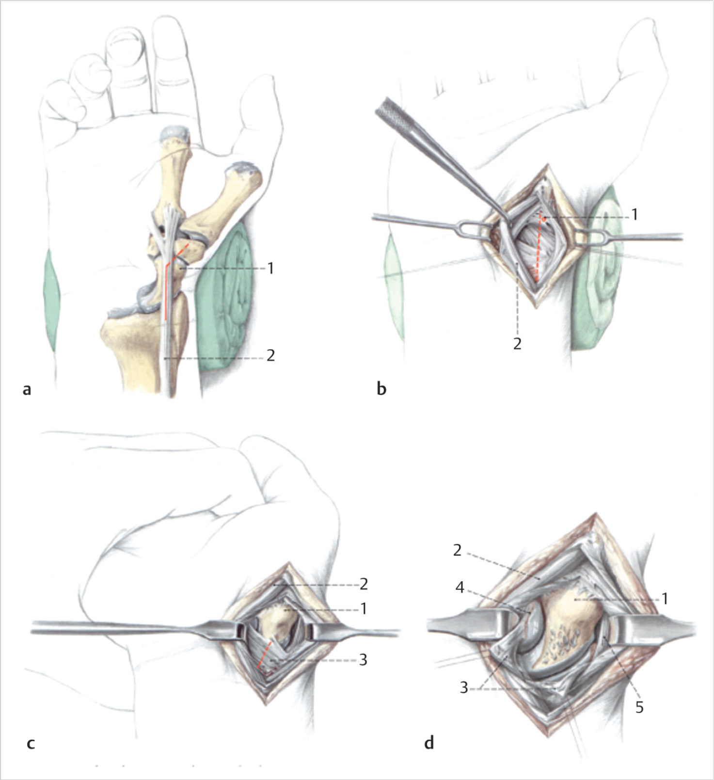The scaphoid is approached volarly (► Fig. 50.1), and the flexor carpi radialis tendon is retracted and a volar capsulotomy performed (► Fig. 50.2)