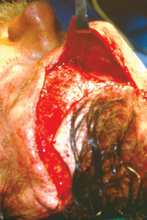 Muscular tissue does not tolerate expansion nearly as well as vascular tissue. Muscle thinning, necrosis, atrophy, and clinical weakness have all been observed. 33 In the face, this would be most concerning if expansion were to weaken the frontalis or other muscles of facial expression. Neural tissue is rather tolerant of expansion and gradual lengthening of nerves can be accomplished without necrosis. Experimental studies have shown that peripheral nerves can be lengthened up to 32% with longterm expansion but perhaps with some diminished function. 34 The facial nerve has been studied during rapid expansion by Martini et al, 35 who found the facial nerve of a cat to be significantly lengthened with intraoperative expansion. However, 40% of the expanded nerves failed to regenerate, likely due to mechanical axonal disruption or from compromised vascularity. Therefore, it is probably prudent to place expanders in the face and neck superficial to the facial nerve and superficial musculoaponeurotic system (SMAS) in the cheek or platysma in the neck to minimize potential injury to the facial nerve.