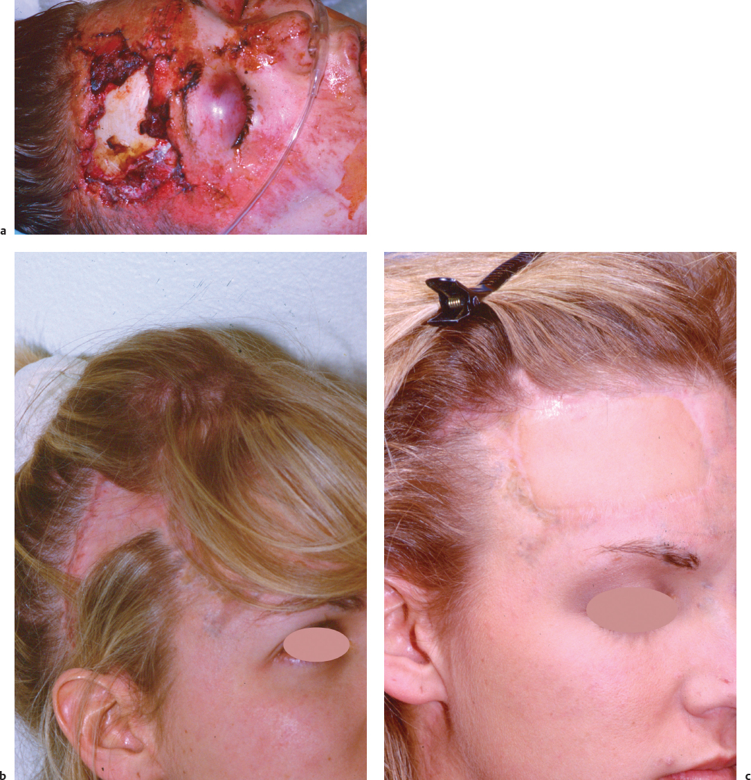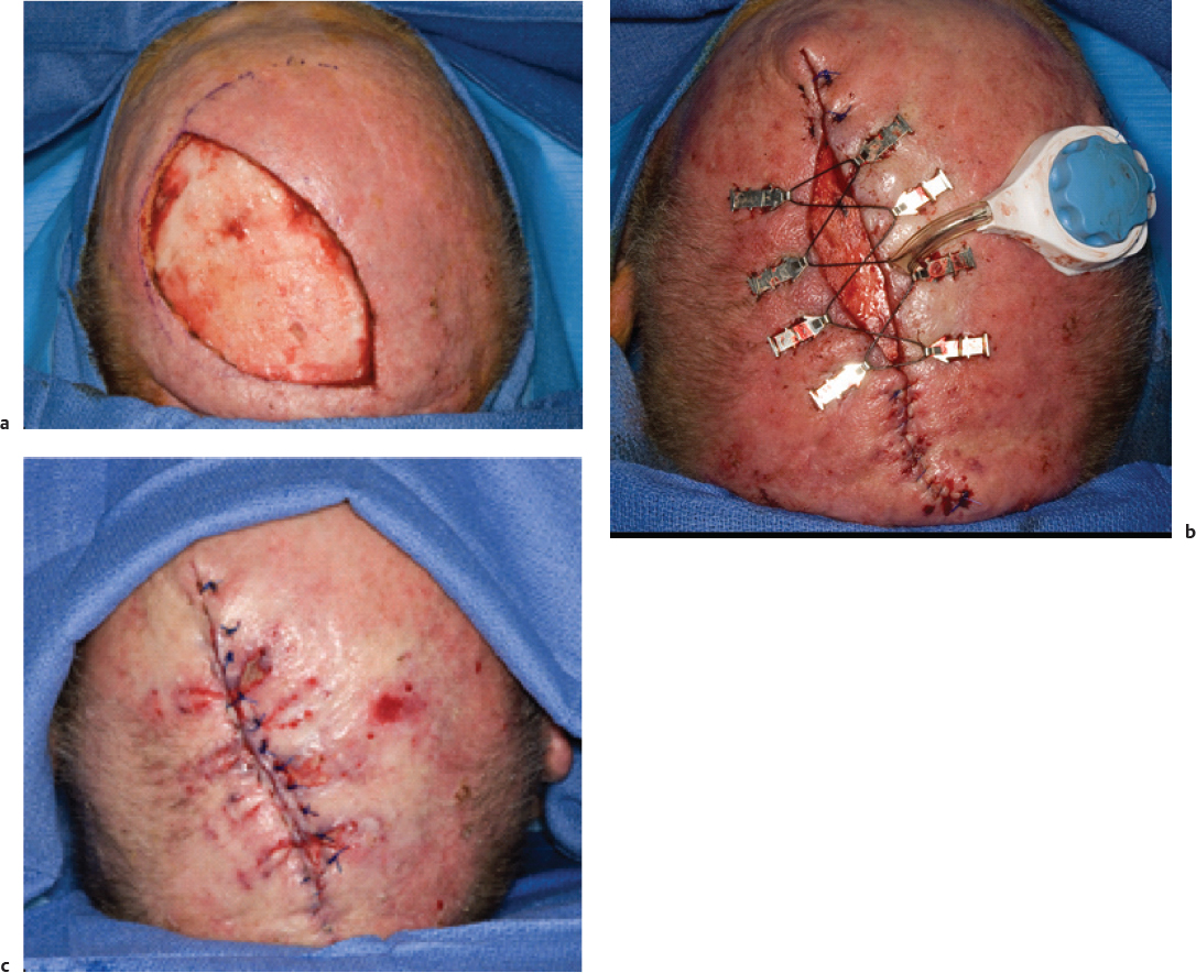 There have been recent reports of the use of external tissue expansion devices. These devices come in the form of adhesive and elastic tapes 44 , 45 or a mechanical tensioning device. 46 Both of these devices are applied for 1–14 days depending on the defect or surgical goal. As such, the principle benefit is derived from mechanical creep as described previously as there is not enough time for the physiological changes seen in prolonged expansion to occur. The external adhesive devices (DynaClose; Canica Design Inc.) have proven useful in the primary closure of forearm free flap donor sites when applied to the donor site 1 week prior to flap harvest. 44 , 45 The external tensioning device (Derma Close RC; Wound Care Technologies Inc.) has proven useful in the management of large scalp defects with reduction in wound size from 50 to 99% after 6 to 14 days of external expansion 46 ( Fig. 50.3 ). Further clinical studies will be needed to determine whether these devices may have other applications in facial reconstruction.