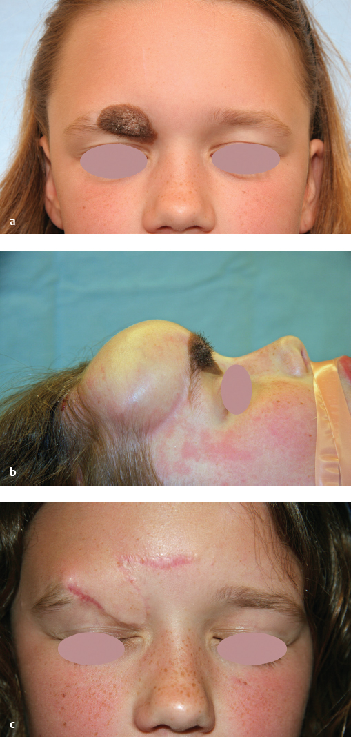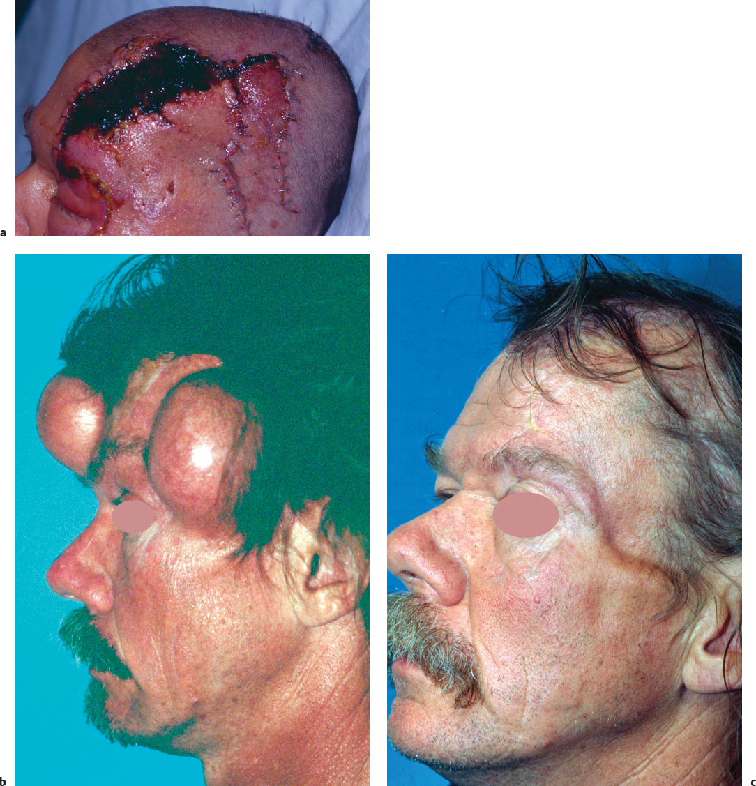 Tissue expansion is theoretically possible anywhere within the head and neck. Clinical experience, however, has shown that some areas are better suited to expansion because of thick overlying skin and a robust blood supply. Tissue expansion works best in locations where there is a solid bony support under the expander balloon device. For example, the scalp 47 , 48 and forehead 49 ( Fig. 50.4 ) are optimal locations for longterm expansion. Staged repair of extensive scalp defects ( Fig. 50.5 ) and hair replacement 50 , 51 , 52 are excellent opportunities to employ tissue expansion. Some surgeons have also advocated tissue expanders in auricular or microtia reconstruction. 53 , 54 , 55 , 56 However, as discussed previously with forehead flaps, the potential for contracture of an expanded flap as well as thickening of the tissue from the expander capsule may limit the application of expanded flaps used for ear and nose reconstruction. In these cases, a thin and pliable soft tissue coverage is essential to allow the underlying cartilaginous framework to show through. Expansion may also be used for large defects in the cheek secondary to skin cancer ( Fig. 50.6 ) or congenital lesions such as hairy nevi 57 , 58 , 59 ( Fig. 50.7 ). The surgeon should remember, however, that the cheek skin may not tolerate expansion well because the skin is relatively thin and there is potential for damage to the facial nerve and musculature. When an expander is employed in the cheek, it may be necessary to inflate the expander with smaller volumes of fluid over an extended period of time to minimize complications such as wound necrosis or expander exposure. Similarly, tissue expansion in the neck may be limited by the thin skin and underlying neurovascular structures. Tissue expansion may be particularly helpful in previously irradiated areas because of the enhancement of the vascularity, which is provided by the expansion. 60 However, one should be particularly cautious in these patients as their tissues will be more fragile and are potentially more prone to breakdown leading to exposure or extrusion of the expander (see Fig. 50.11 ). Romo and colleagues 61 have described a series of patients in whom a small tissue expander was placed intranasally to provide additional tissue for the successful repair of large septal perforations. Several reports have appeared in the literature describing the application of tissue expansion in regional or distant free flaps prior to their elevation and transfer to head and neck defects. 62 , 63 , 64 , 65 , 66 Preexpansion of flaps may lessen donor site morbidity as well as provide more tissue for transfer that has an enhanced blood supply. Whenever possible, the reconstructive surgeon should try to anticipate the size of the defect prior to its resection and plan the expansion accordingly. If one is faced with a large defect that will optimally be repaired with an expanded flap, consideration could be given to a temporary coverage with a skin graft while the expansion is underway. Once the expansion is completed, the skin graft can be excised and replaced with the expanded flap.